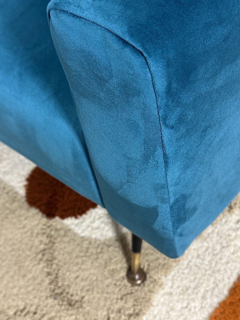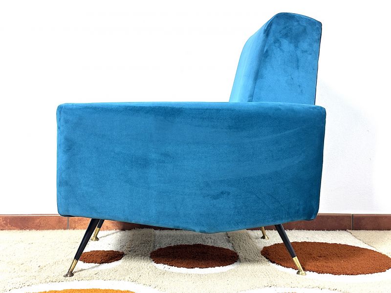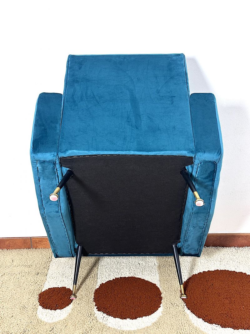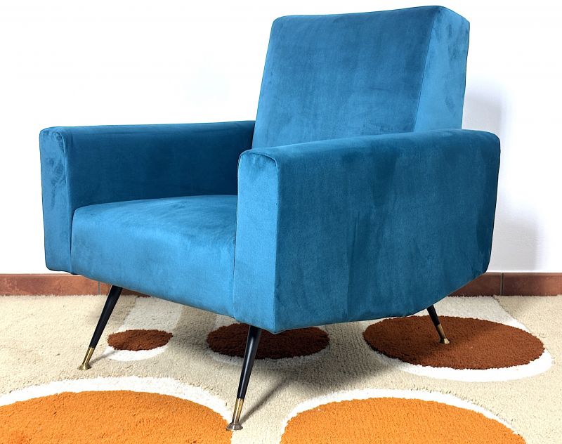 Splendida poltrona iconica del design Mid-Century italiano anni 60. La poltrona è stato oggetto di un restauro integrale che ne ha preservato l'anima vintage pur garantendo la massima durata per l'uso contemporaneo. Linee geometriche e pulite, tipiche della scuola di design milanese del dopoguerra. Lo schienale alto e leggermente inclinato offre un supporto ottimale, mentre i braccioli squadrati definiscono un profilo architettonico deciso. Il rivestimento è in un pregiato velluto liscio color ottanio/blu, una tonalità ricercata che cambia riflessi a seconda della luce. La struttura poggia sulle classiche gambe "a spillo" in metallo con puntali in ottone originali che conferiscono un tocco di luce e raffinatezza. CONDIZIONI ECCELLENTI Misure: Altezza cm 80 - Larghezza cm 74 - Profondità cm 80 - Seduta cm 50 x 50 - Altezza seduta cm 40