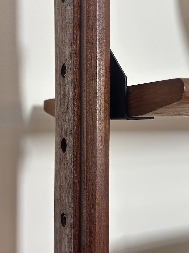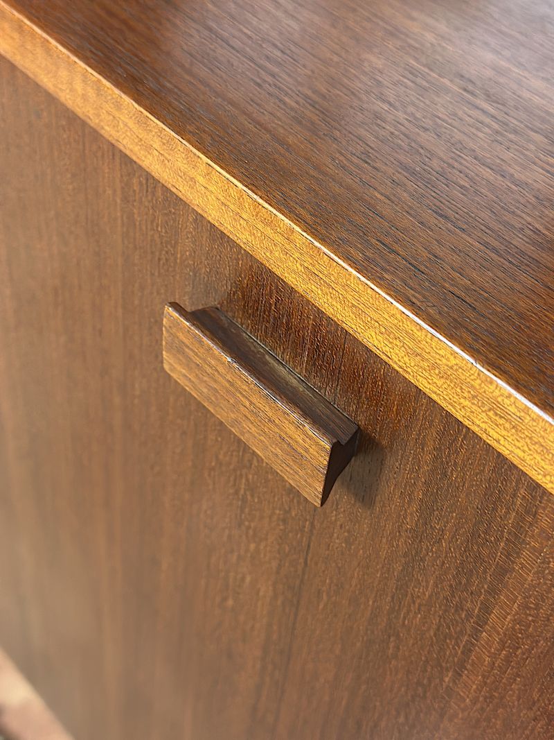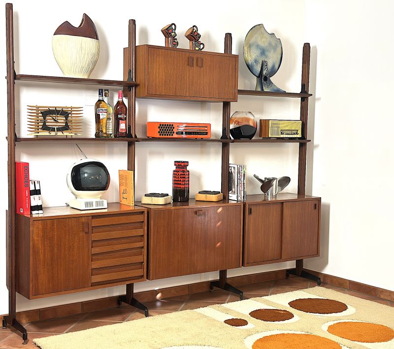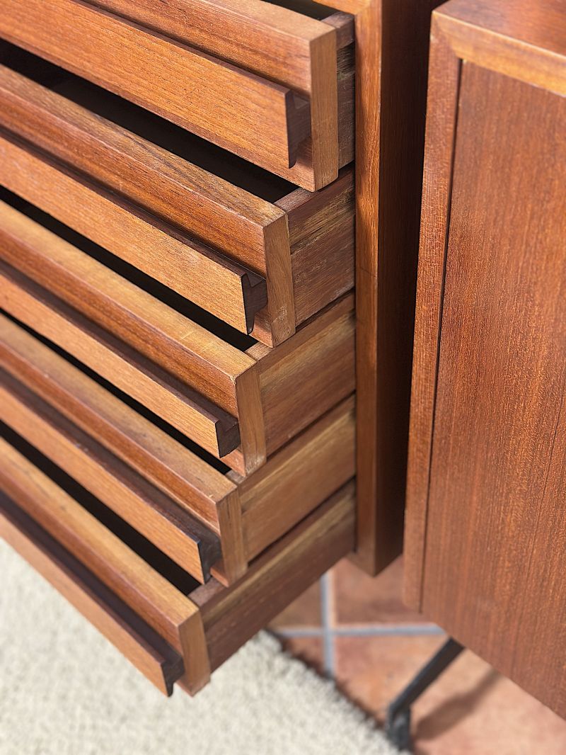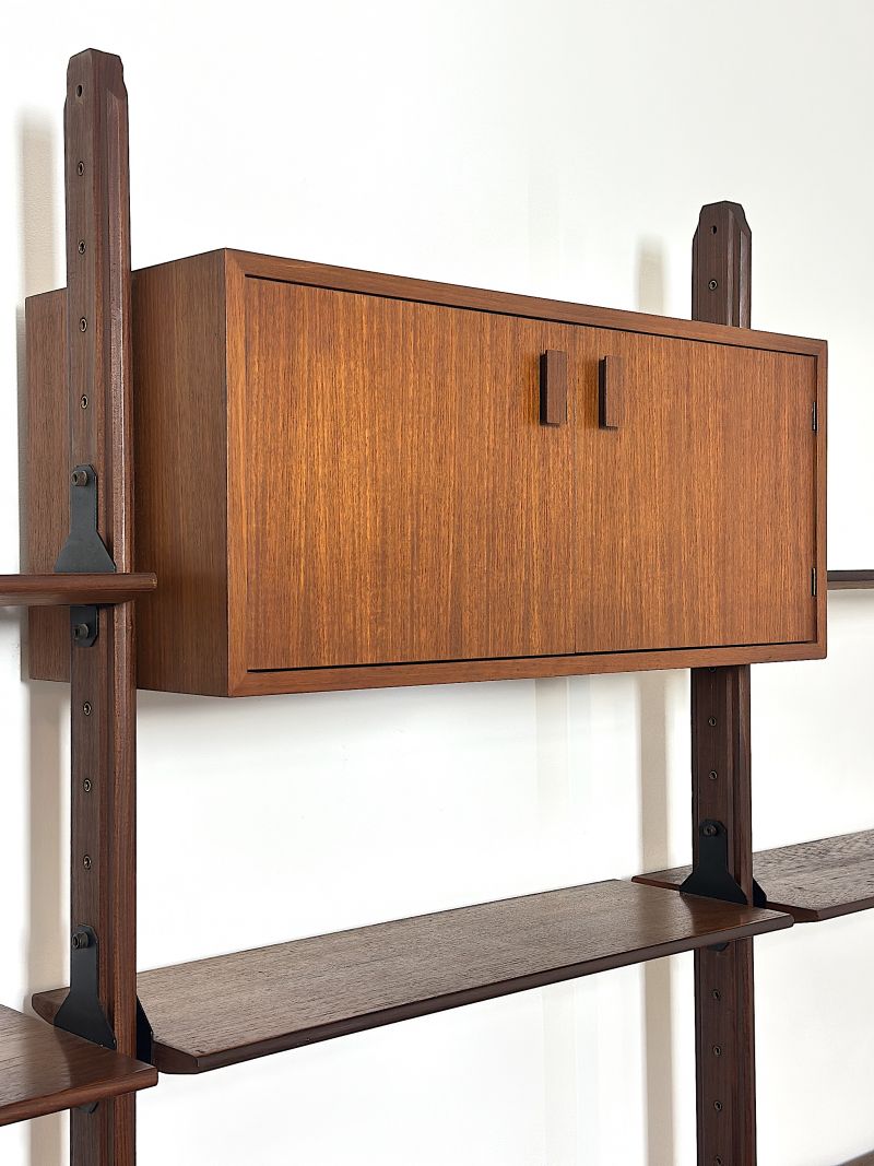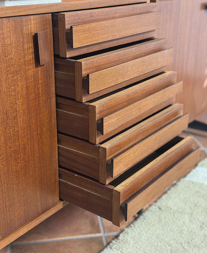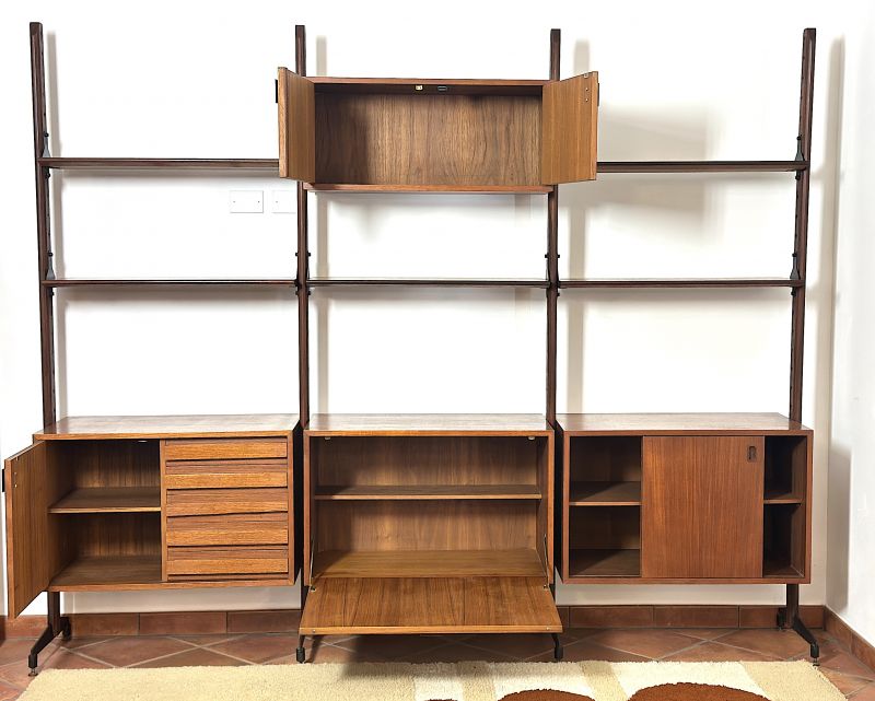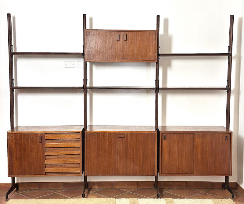 Libreria modulare Bifacciale a 3 campate Anni 60. La libreria è di manifattura Italiana completamente restaurata e sanificata,realizzata in legno massello impiallacciato Teack. Il design italiano degli anni 60 era caratterizzato da una combinazione di estetica moderna e con materiali innovativi, design minimalista con forme geometriche pulite e linee rette. La libreria è composta da un modulo con due ante apribili ,un modulo con 5 cassetti una anta e ripiano interno, un modulo con anta a ribalta e ripiano interno ,un modulo con ante scorrevoli e ripiano interno,5 mensole, montanti in legno con piedi in metallo e puntali in ottone regolabili. La struttura è realizzata con la possibilità di essere posizionata come divisorio d'ambiente in quanto rifinita anche sul retro. Tutti gli elementi sono regolabili a piacimento. CONDIZIONI PERFETTE Misura:Altezza 206-Profondità cm 42-Larghezza totale cm 252