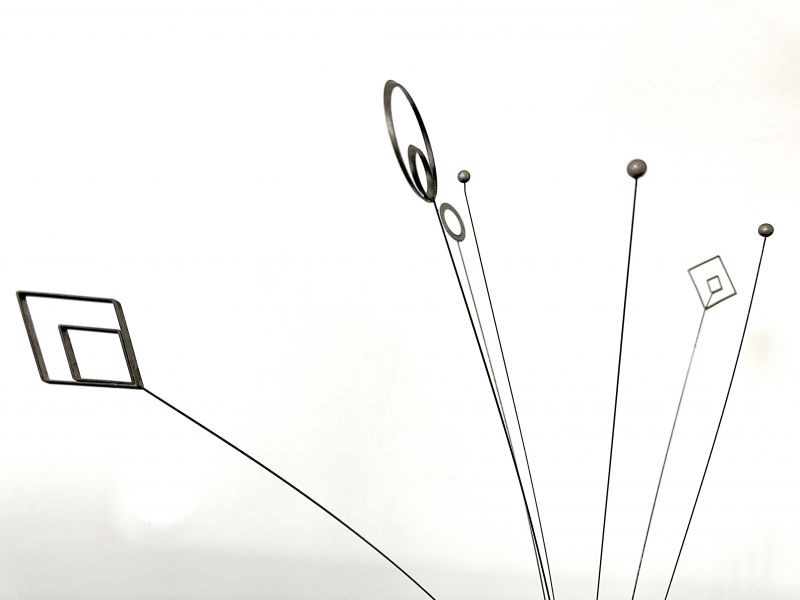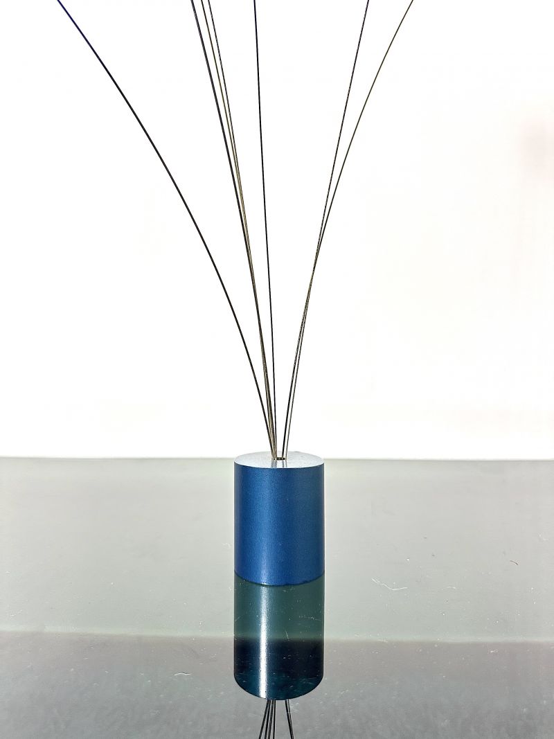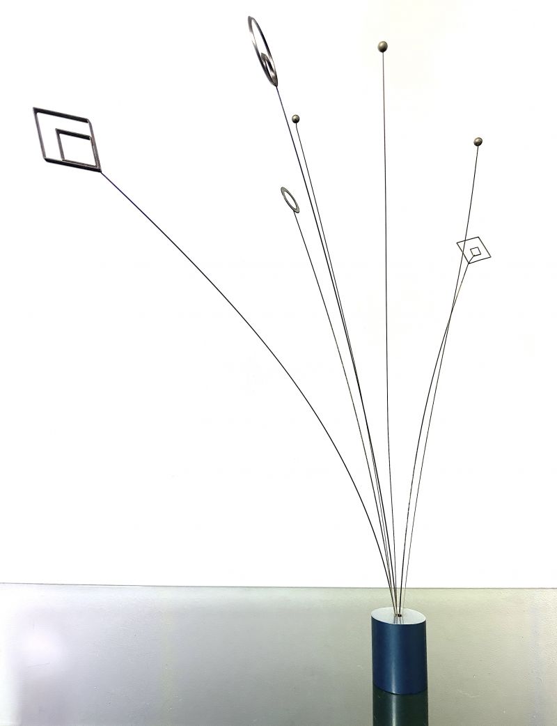 Opera d'arte cinetica intitolata "Signal" Anni 60 Made in Italy. Queste sculture sono caratterizzate da sottili aste metalliche che terminano con elementi geometrici, progettate per oscillare dolcemente con il movimento dell'aria, la base è realizzata da un cilindro metallico di colore blu copiativo,un tocco di modernismo d'avanguardia per la tua collezione. CONDIZIONI PERFETTE Misura: Altezza cm 60-Larghezza cm 5-Profondità Cm 5