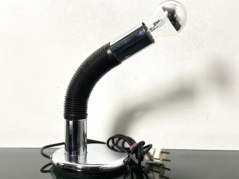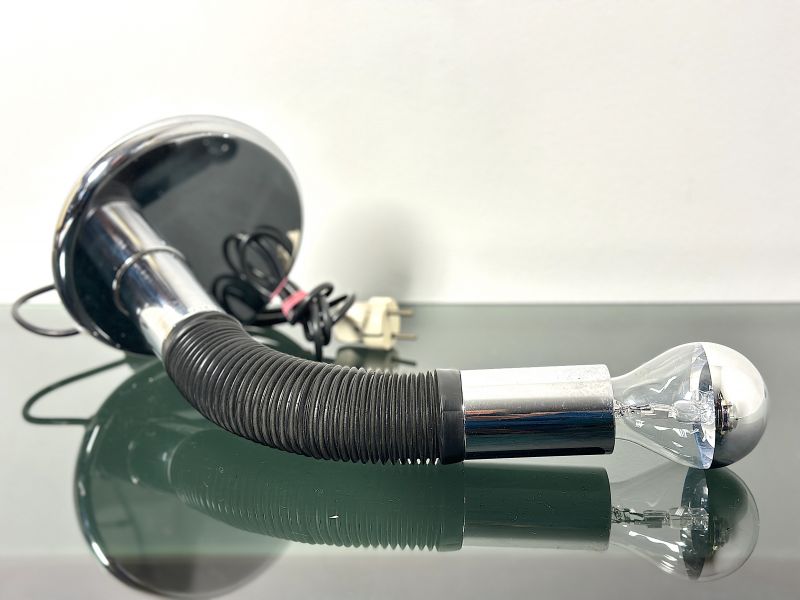 Porta un tocco di futurismo vintage nei tuoi spazi con la leggendaria lampada Elbow di Targetti Sankey. Progettata nei primi anni '70 e vincitrice dell'iF Design Award, questa lampada è l'emblema dello stile Space Age italiano. Prodotta in Italia da Targetti Sankey negli anni '70 e disegnata dal celebre architetto e designer Mario Bellini,base circolare in metallo cromato, stelo cromato e un caratteristico tubo flessibile ("collo di cigno") in plastica nera rigata che permette di orientare la luce. CONDIZIONI PERFETTE Misura: Altezza cm 40 - Diametro cm 18
