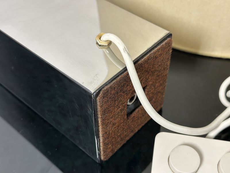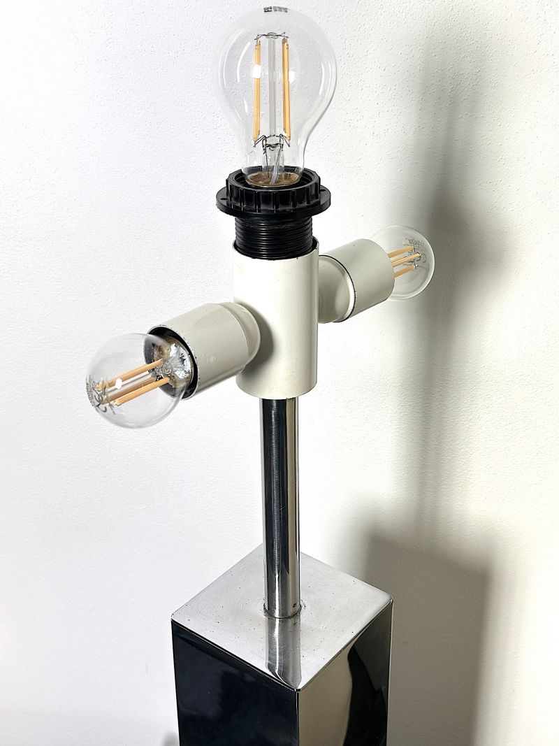 Raffinata lampada da tavolo d'epoca, autentico esempio di modernariato italiano degli anni '70. Questo modello è caratterizzato da una solida base a colonna a sezione quadrata in metallo cromato lucido, elemento distintivo delle produzioni di Goffredo Reggiani. La struttura riflettente crea un gioco di specchi dinamico, tipico dell'estetica Space Age e Hollywood Regency. Il grande paralume cilindrico originale in tessuto diffonde una luce morbida e accogliente, rendendola ideale come lampada da lettura o come elemento d'arredo per scrivanie e tavoli d'appoggio in interni eleganti e contemporanei. CONDIZIONI PERFETTE Misure: Altezza cm 95 . Larghezza cm 40 -Profondità cm 40 - Base 10 x 10 x 30