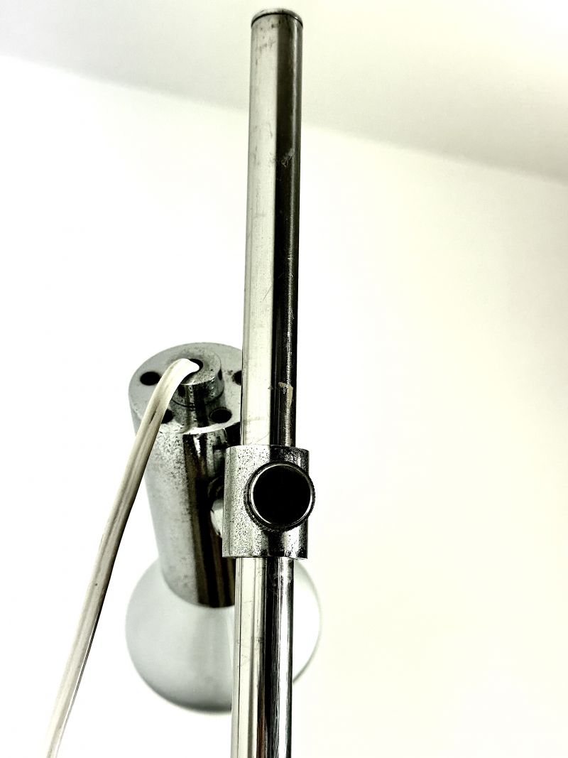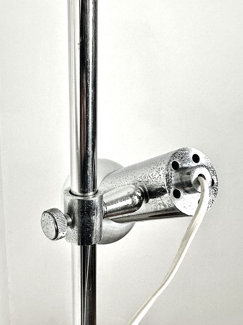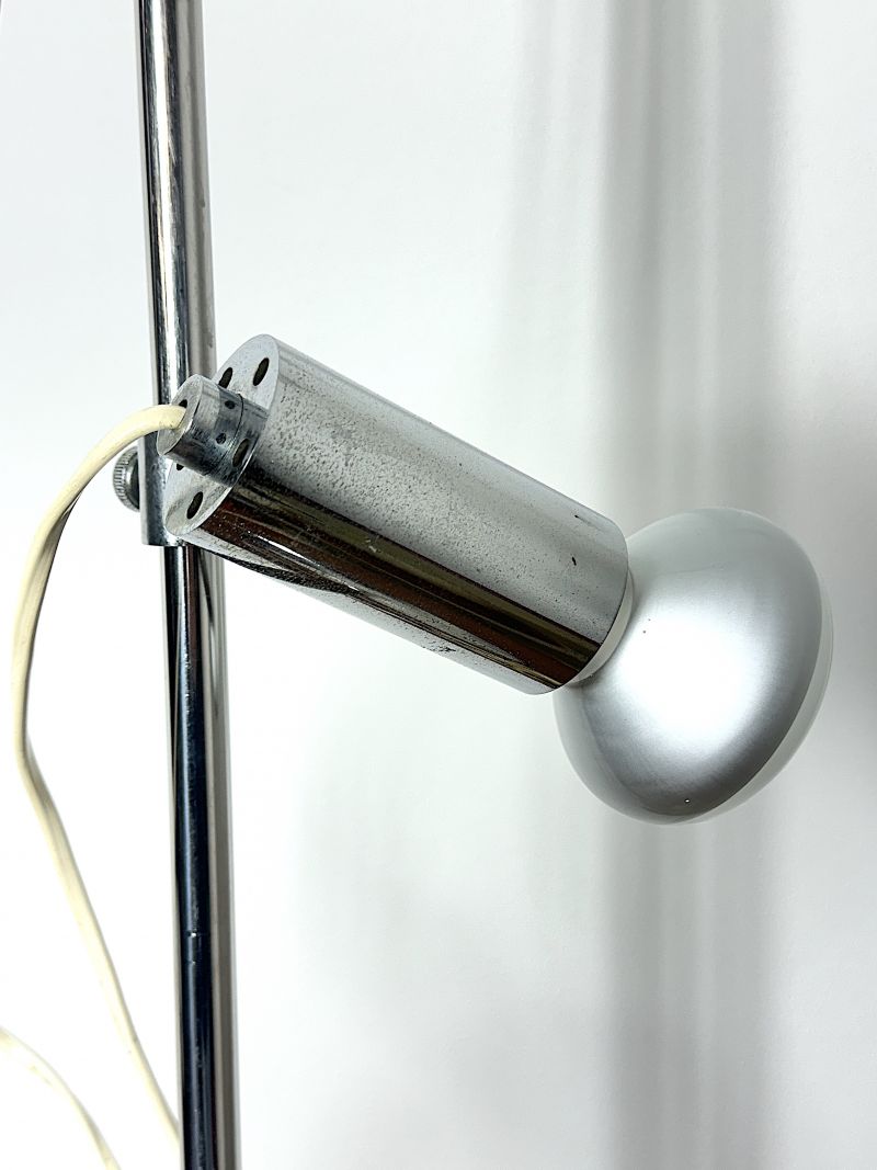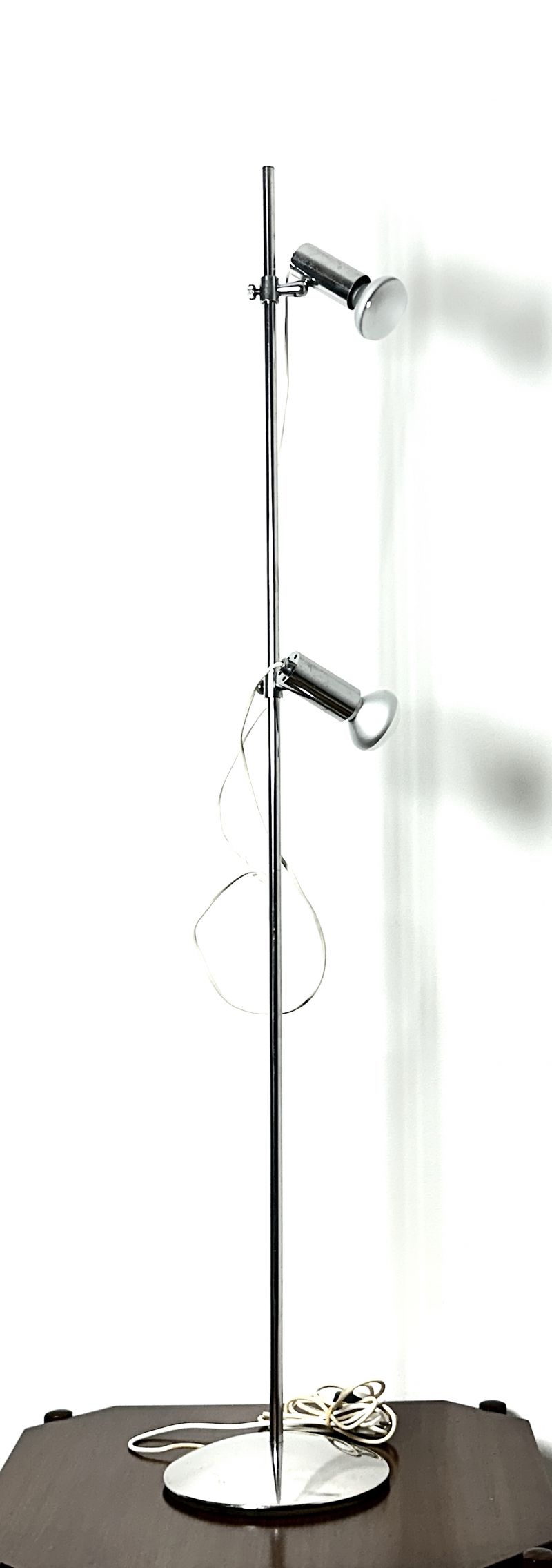 Questa è una splendida piantana prodotta da Reggiani Illuminazione tra la fine degli anni '60 e l'inizio degli anni '70. Si tratta di un pezzo iconico, molto ricercato per il suo stile minimalista e industriale, interamente realizzata in acciaio cromato lucido. I due faretti cilindrici possono essere fatti scorrere lungo l'asta centrale e ruotati a 360° grazie agli snodi a farfalla, permettendo un'illuminazione personalizzata. Base circolare in metallo cromato che garantisce grande stabilità. Linee essenziali e slanciate, perfette per ambienti in stile Space Age o contemporaneo.struttura solida e cromatura ben conservata. Sono presenti alcuni puntini di ossidazione quasi impercettibili su i due faretti dovuti al normale utilizzo vintage. L'impianto elettrico è originale e perfettamente funzionante. CONDIZIONI PERFETTE Misure: Altezza cm 160 - Diametro Base cm 28