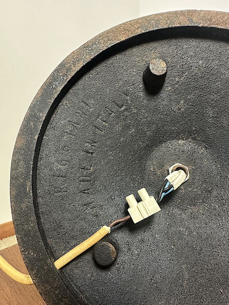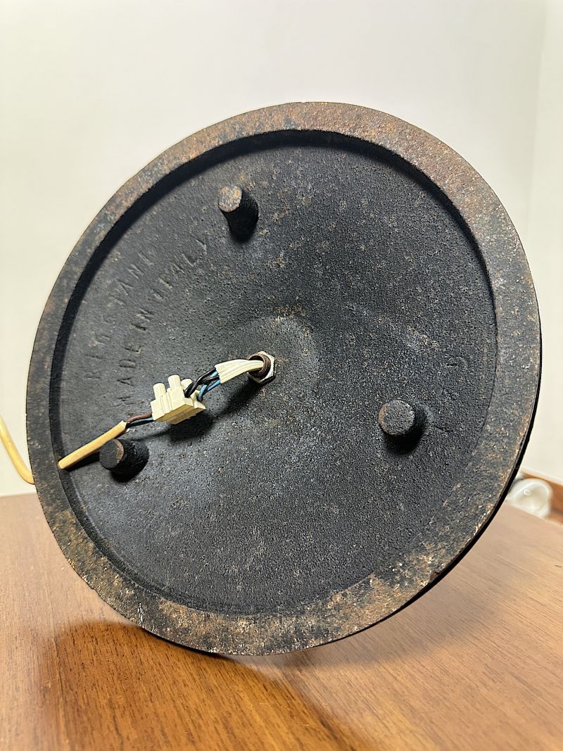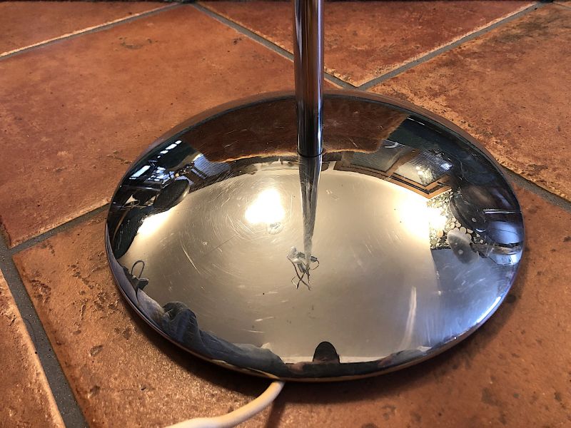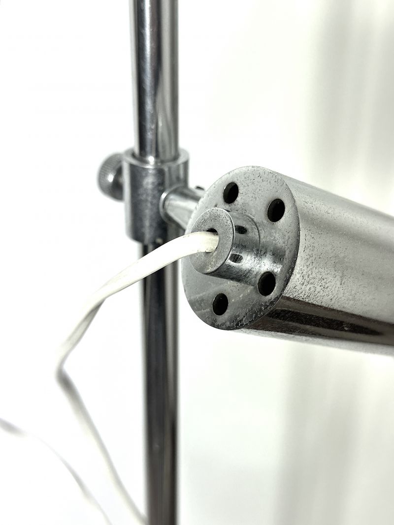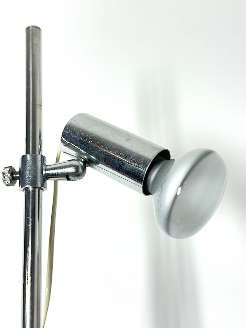 Questa è una splendida piantana prodotta da Reggiani Illuminazione tra la fine degli anni '60 e l'inizio degli anni '70. Si tratta di un pezzo iconico, molto ricercato per il suo stile minimalista e industriale, interamente realizzata in acciaio cromato lucido. I due faretti cilindrici possono essere fatti scorrere lungo l'asta centrale e ruotati a 360° grazie agli snodi a farfalla, permettendo un'illuminazione personalizzata. Base circolare in metallo cromato che garantisce grande stabilità. Linee essenziali e slanciate, perfette per ambienti in stile Space Age o contemporaneo.struttura solida e cromatura ben conservata. Sono presenti alcuni puntini di ossidazione quasi impercettibili su i due faretti dovuti al normale utilizzo vintage. L'impianto elettrico è originale e perfettamente funzionante. CONDIZIONI PERFETTE Misure: Altezza cm 160 - Diametro Base cm 28