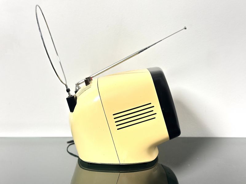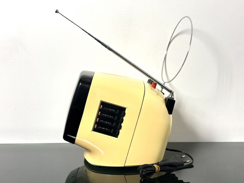 Un capolavoro del design industriale italiano: il televisore portatile Rex L9, progettato nel 1972 dal celebre architetto e designer Luigi Molinis. Questo modello rappresenta l'apice della sperimentazione estetica di Molinis per il gruppo Zanussi, fondendo la funzionalità di un apparecchio portatile con le linee audaci e futuristiche della Space Age. Caratterizzato da una scocca in plastica dalle forme morbide e avvolgenti, il Rex L9 è famoso per la sua maniglia integrata a scomparsa e i controlli laterali a cursore, elementi che ne sottolineano l'ergonomia d'avanguardia. È un pezzo da collezione, perfetto per chi cerca un oggetto che sia al contempo storia della tecnologia e arte moderna. PERFETTAMENTE FUNZIONANTE Misure: Altezza cm 24-Larghezza cm 24 -Profondità cm 26 -Schermo da 9 Pollici