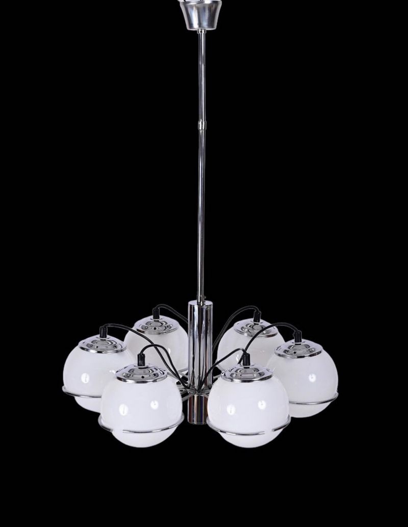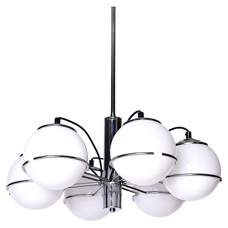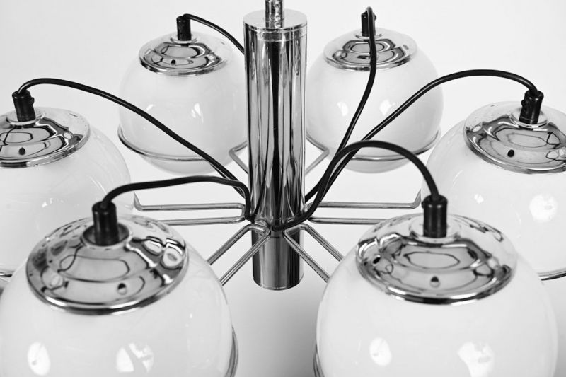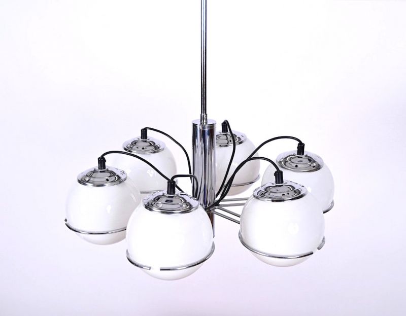 Lampadario in cromo e vetro opalino disegnato da Targetti Sankey negli anni '70. I globi di vetro opalino bianco sembrano fluttuare nella struttura cromata, Vetri e cromature in perfette condizioni,effettuato cablaggio impianto elettrico nuovo. Il design e la linea strutturale è decisamente futuristica per i canoni degli anni 70,tale periodo è denominato SPACE AGE. CONDIZIONI PERFETTE Misure:Altezza cm 65-Larghezza cm 60-Diametro sfere cm 20