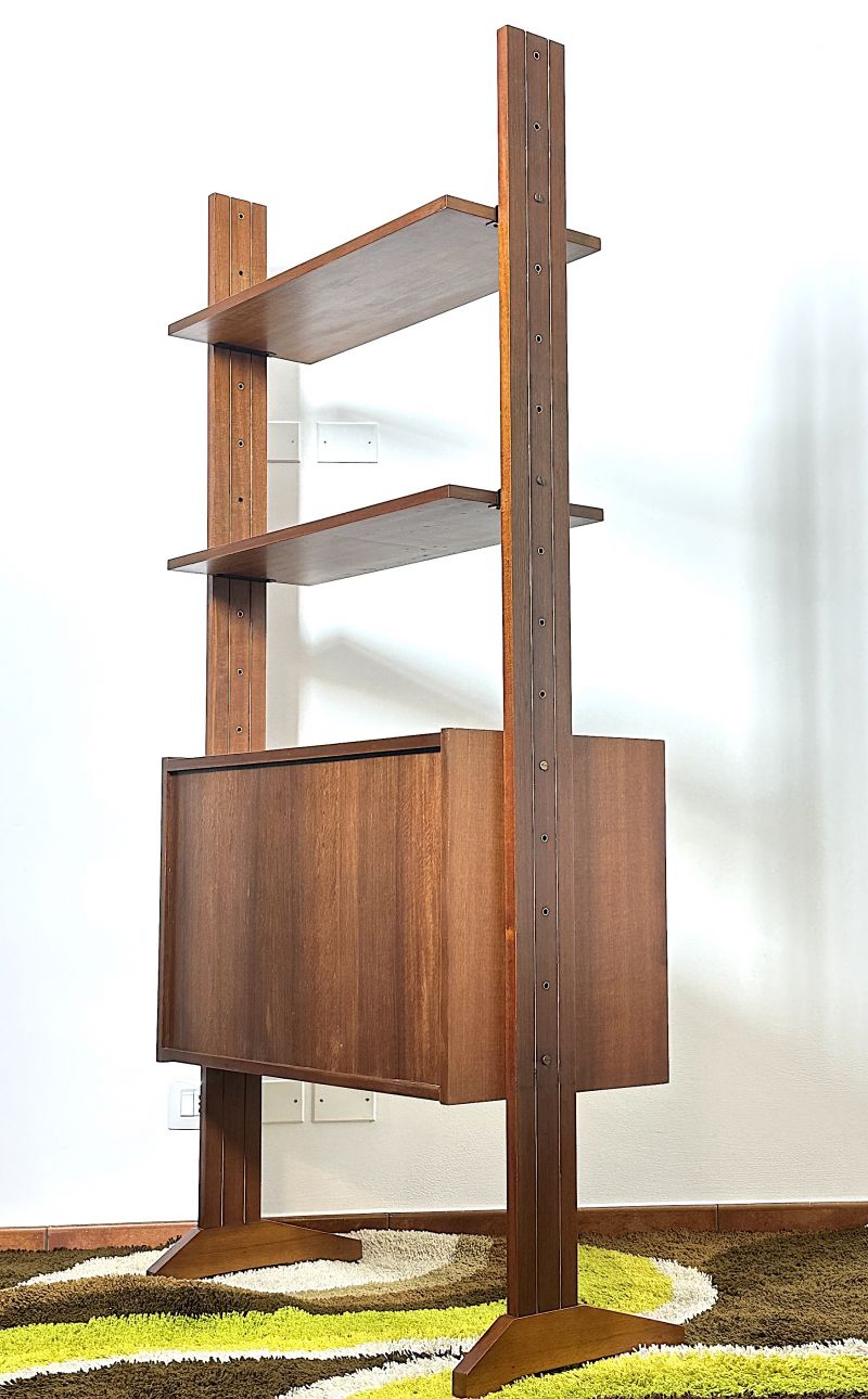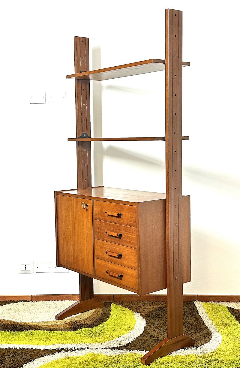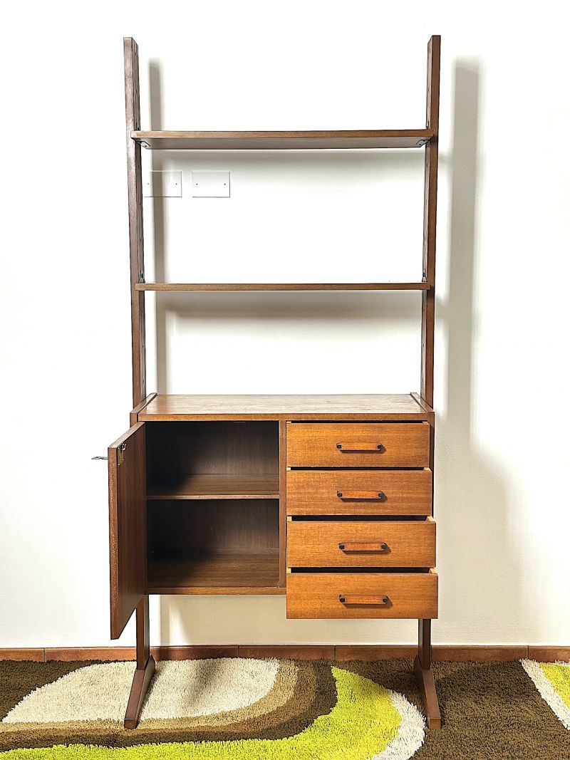 Libreria modulare a 1 campate Anni 60, di manifattura Italiana completamente restaurata e sanificata. La Libreria è realizzata in legno massello impiallacciato Teack, composta da 2 mensole,1 modulo con 1 anta apribile con ripiano interno,4 cassetti ,ferramenta in metallo e ottone, tutti gli elementi sono regolabili a piacimento. CONDIZIONI PERFETTE Misura:Altezza 186-Larghezza cm 85 - Profondità cm 40