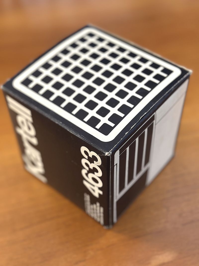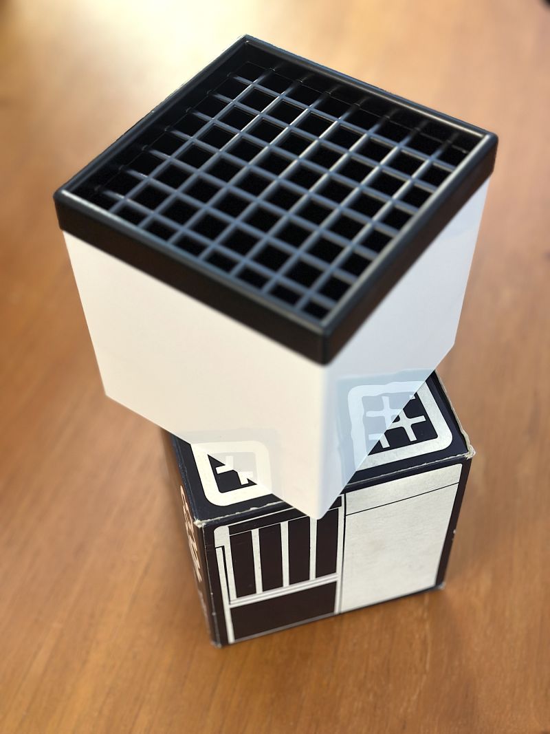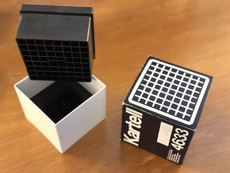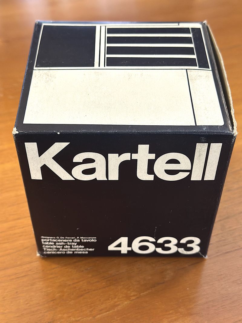 A rare and iconic piece of industrial design, this model 4633 ashtray, produced by Kartell in the 1970s, perfectly embodies the Space Age aesthetic of the era. Designed by renowned Italian designers Giorgio De Ferrari and Paolo Maccarrone, it is a highly prized collector's item. This ashtray stands out for its minimalist cubic shape and its intelligent functionality. The black grille lid is cleverly designed to effectively hide ash and butts, maintaining a clean and discreet appearance. The example for sale is in excellent condition, practically like new ("warehouse"), and is complete with its original box, as shown in the photo. A versatile object that can act both as an elegant ashtray and, given its structure, as an original pen holder or desk organizer. Measurements: Height 11 cm - Width 11 cm - Depth 11 cm