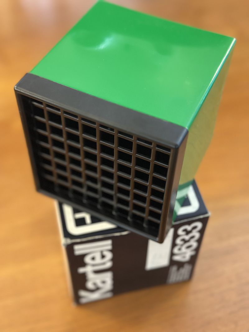 A rare and iconic piece of industrial design, this model 4633 ashtray, produced by Kartell in the 1970s, perfectly embodies the Space Age aesthetic of the era. Designed by renowned Italian designers Giorgio De Ferrari and Paolo Maccarrone, it is a highly prized collector's item. This ashtray stands out for its minimalist cubic shape and its intelligent functionality. The black grille lid is cleverly designed to effectively hide ash and butts, maintaining a clean and discreet appearance. The example for sale is in excellent condition, practically like new ("warehouse"), and is complete with its original box, as shown in the photo. A versatile object that can act both as an elegant ashtray and, given its structure, as an original pen holder or desk organizer. Measurements: Height 11 cm - Width 11 cm - Depth 11 cm