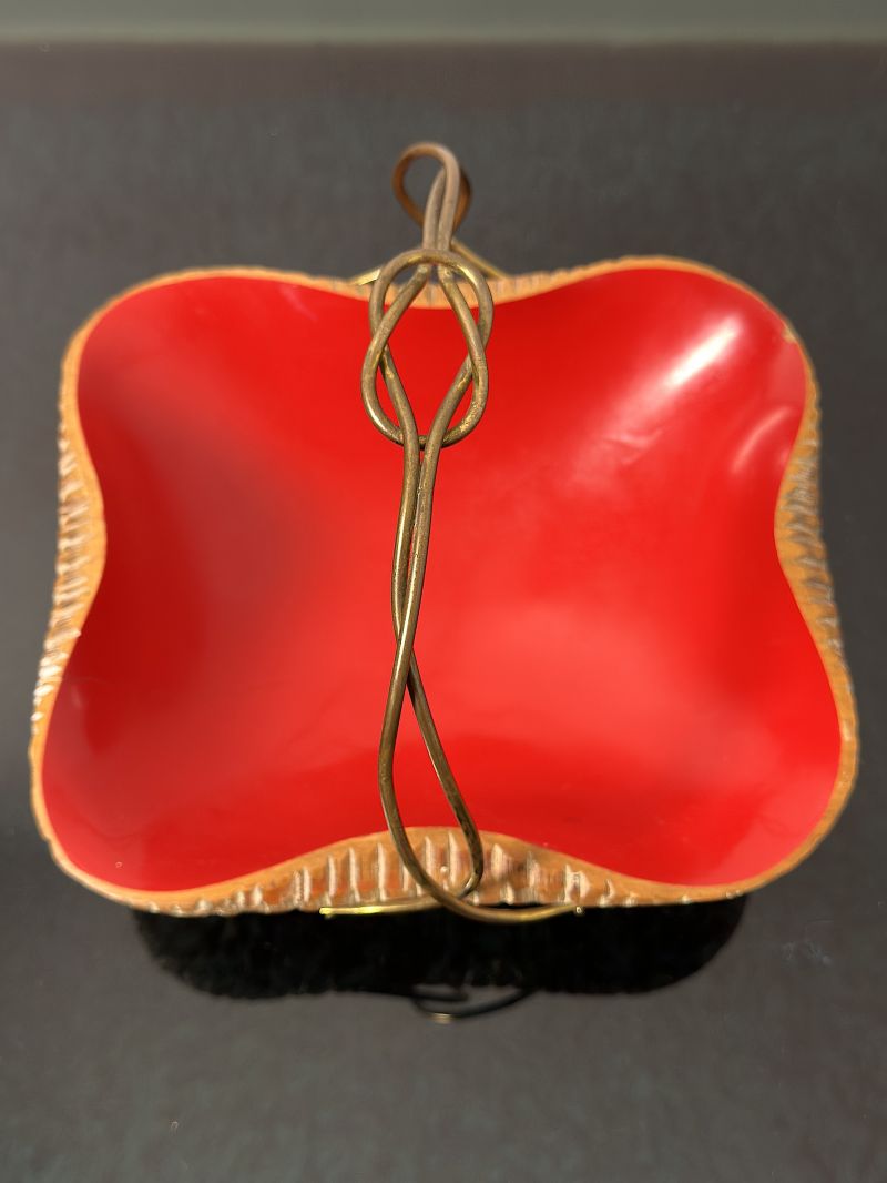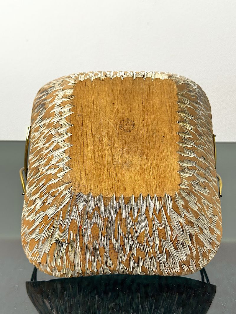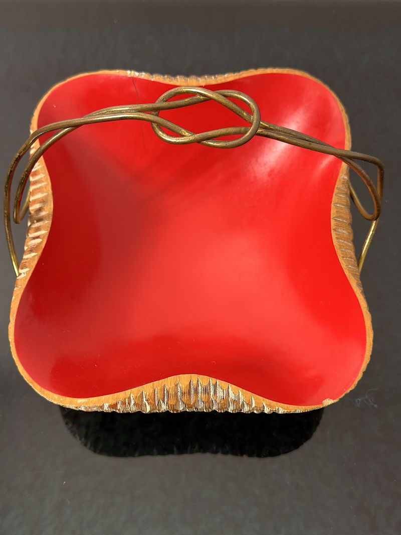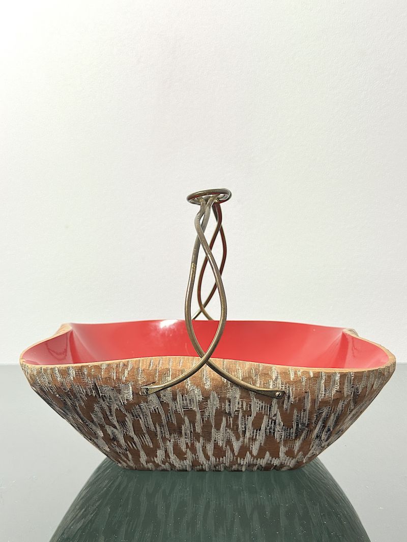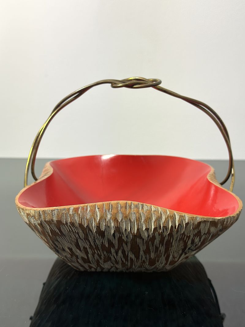Basket centerpiece designed by the famous Aldo Tura for Macabo (Cusano Milanino) in the 1950s. This object is not a simple furnishing accessory, but a true sculpture that testifies to the high Milanese craftsmanship of the post-war period. Tura is known for the use of fine materials and organic shapes, and this basket is one of the most iconic examples, made of fine walnut wood, entirely hand-carved with a relief texture typical of Tura/Macabo production, internal finish bright red lacquered, which creates a vibrant color contrast, the handle is made of hand-braided brass, finished with the characteristic decorative knot on the top. Perfect as a pocket emptier in a classy entrance or as a centerpiece in a refined living area. EXCELLENT CONDITIONS Measures; Height 16 cm - Width 20 cm - Depth 21 cm