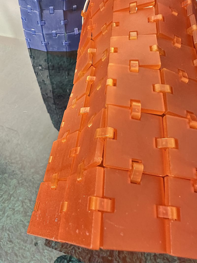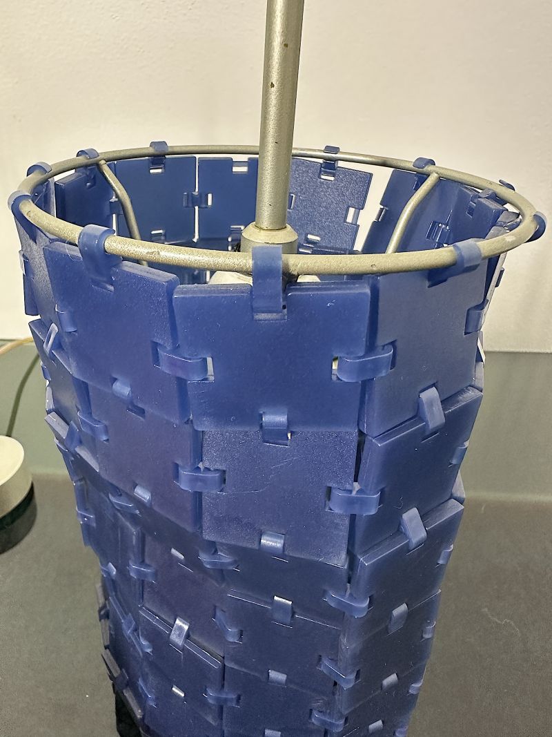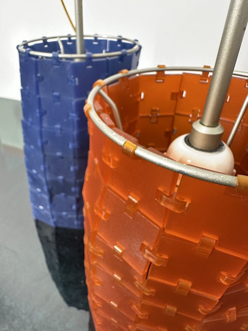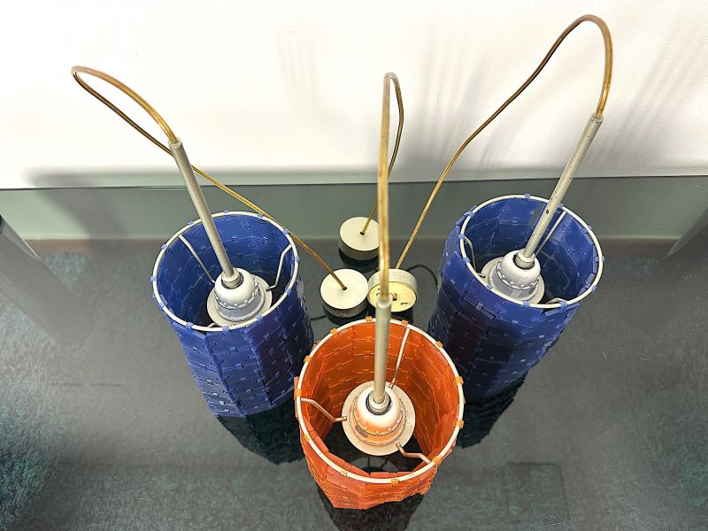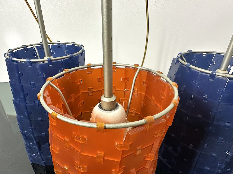 Set of three "Bloc T" model pendant lamps, an icon of Italian postmodern design from the 1980s. Designed by Rodolfo Dordoni for Flos, these lamps represent a perfect synthesis between industrial design and playful creativity. The set consists of: 2 Lamps in Copiative Blue - 1 Lamp in Orange/Amber The unique feature of the Bloc T model is the cylindrical lampshade, created by interlocking 72 small square pieces in colored polycarbonate. This "mosaic" structure allows light to filter through in a soft and geometric way, creating a warm and vibrant atmosphere. The thin and sinuous metal stem gives lightness to the entire figure. The lamps are in excellent vintage condition, the polycarbonate plugs maintain the original color brilliance without cracks or missing parts. PERFECT CONDITIONS Measurements: Height 22 cm - Diameter 12 cm