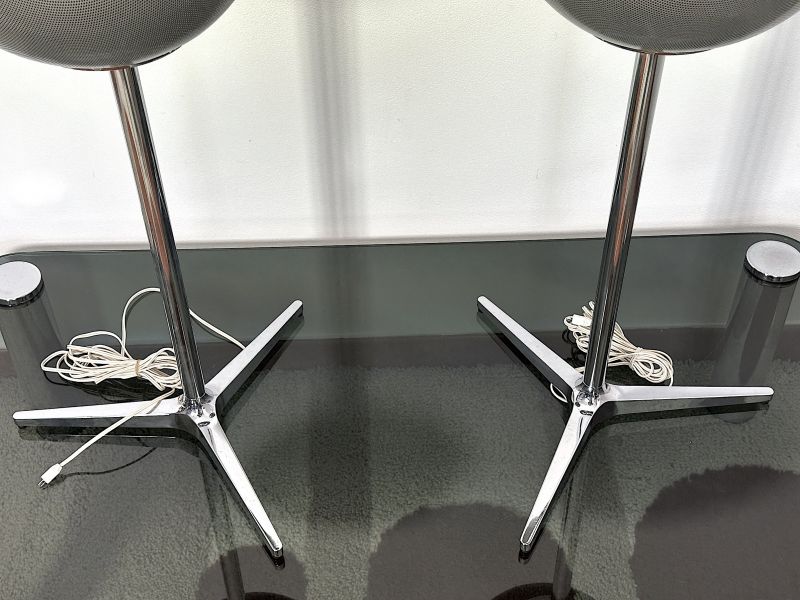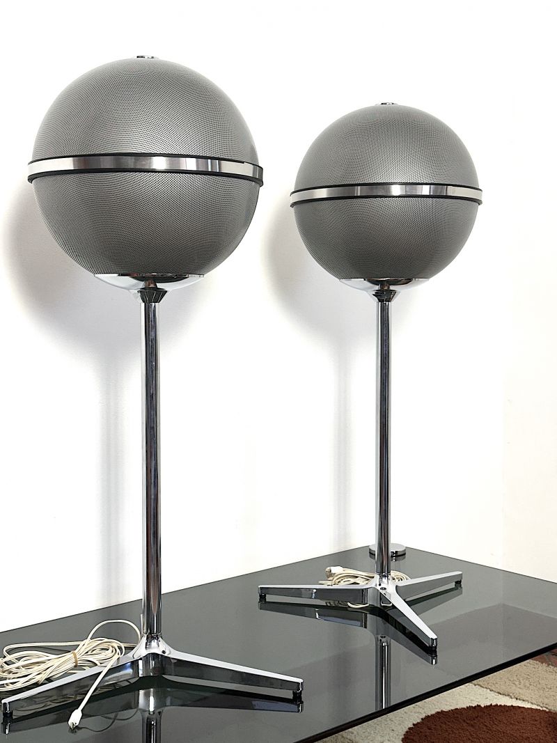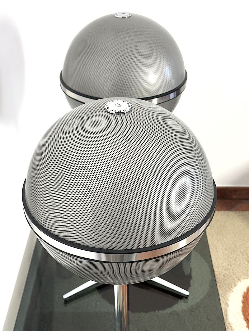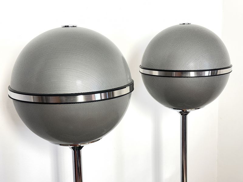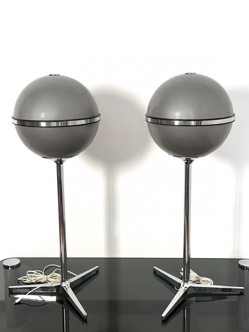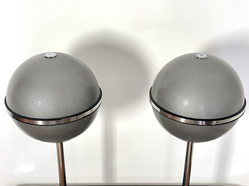 Pair of Grundig Audiorama 8000 spherical hi-fi speakers, the essence of the Space Age style, produced in 1975. This model is famous for its futuristic "ball" design and the stem-shaped stand with horn base, which makes them true modern art objects as well as high-quality speakers. Completely restored, the cases have been returned to factory conditions: Metal caps restored in the original Grunding Gray colour, new central band, brushed aluminum bases and perfectly stable stems. Complete overhaul of the internal components and new wiring to ensure maximum sound fidelity. Speakers: 2 woofers and 2 dome tweeters for each sphere. Power: 50W (Nominal) / 80W (Musical). Impedance: 4 Ohms. Sound: Omnidirectional diffusion, the sound propagates uniformly throughout the room. PERFECT CONDITION - Like new!!! Measurements: Height 90 cm - Diameter of spheres 32 cm - Weight 9.5 kg each