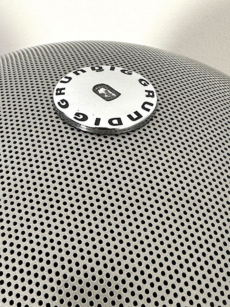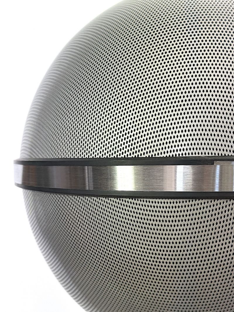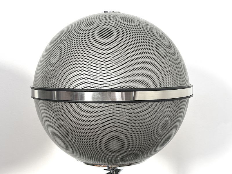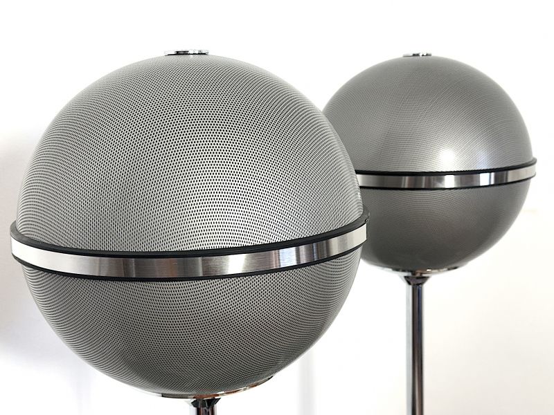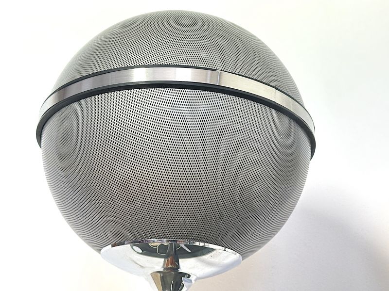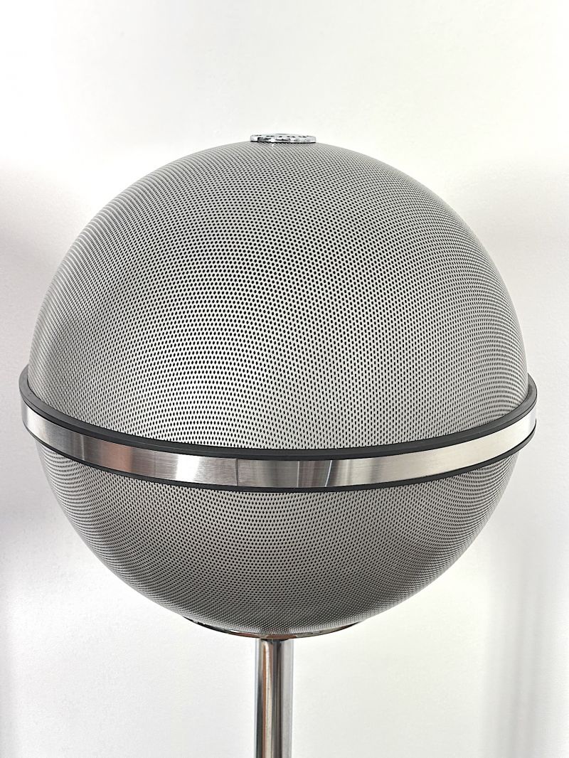 Pair of Grundig Audiorama 8000 spherical hi-fi speakers, the essence of the Space Age style, produced in 1975. This model is famous for its futuristic "ball" design and the stem-shaped stand with horn base, which makes them true modern art objects as well as high-quality speakers. Completely restored, the cases have been returned to factory conditions: Metal caps restored in the original Grunding Gray colour, new central band, brushed aluminum bases and perfectly stable stems. Complete overhaul of the internal components and new wiring to ensure maximum sound fidelity. Speakers: 2 woofers and 2 dome tweeters for each sphere. Power: 50W (Nominal) / 80W (Musical). Impedance: 4 Ohms. Sound: Omnidirectional diffusion, the sound propagates uniformly throughout the room. PERFECT CONDITION - Like new!!! Measurements: Height 90 cm - Diameter of spheres 32 cm - Weight 9.5 kg each