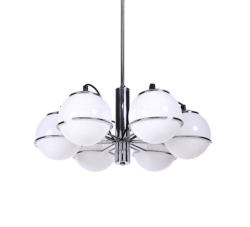 Chrome and opal glass chandelier designed by Targetti Sankey in the 1970s. The white opaline glass globes appear to float in the chrome structure, Glass and chrome in perfect condition, new electrical system wired. The design and structural line is decidedly futuristic by the standards of the 70s, this period is called SPACE AGE. PERFECT CONDITIONS Measurements: Height 65 cm - Width 60 cm -Sphere diameter 20 cm