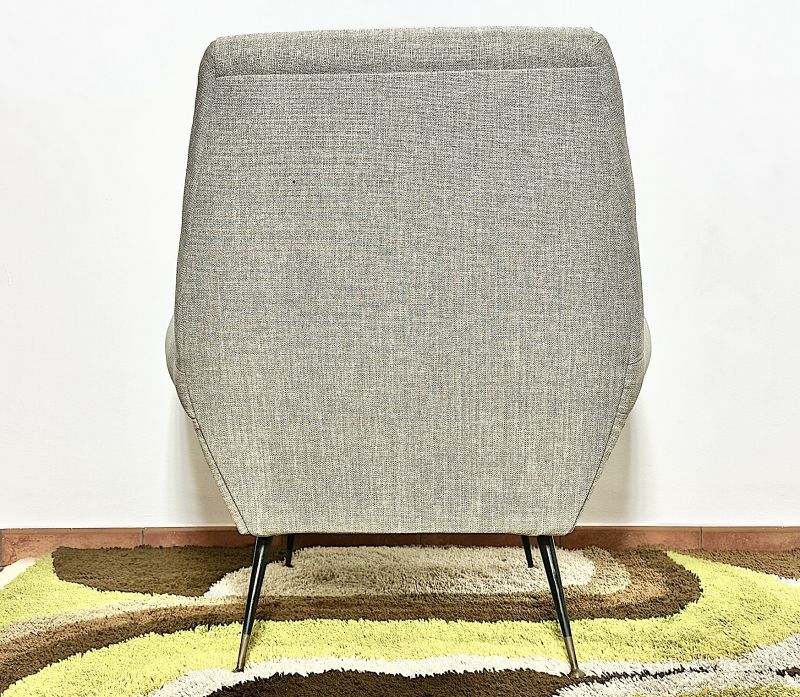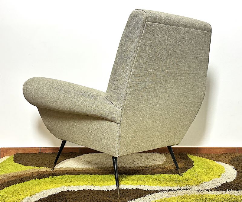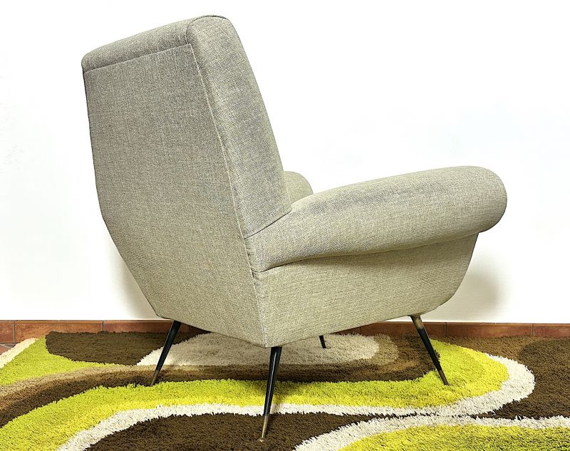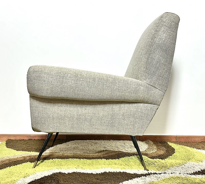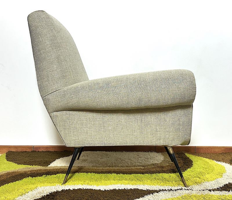 Extraordinary armchair from the 50s by designer GIGI RADICE, an icon of Mid-Century design. This piece perfectly embodies the elegant and sophisticated aesthetics of the era, with a harmonious design and refined details. Characterized by a slender structure, the armchair rests on tapered brass and metal legs, a distinctive element of Radice's creations, which give lightness and refinement, while the careful stitching and the delicately rounded profile draw attention to a high-level manufacturing. Completely restored, new interior and upholstery, the upholstery is in Sand (Beige) colored cotton. PERFECT CONDITIONS Measurements: Height 90 cm - Width 90 cm - Depth 80 cm - Seat 50 x 45 cm - Seat height 45 cm