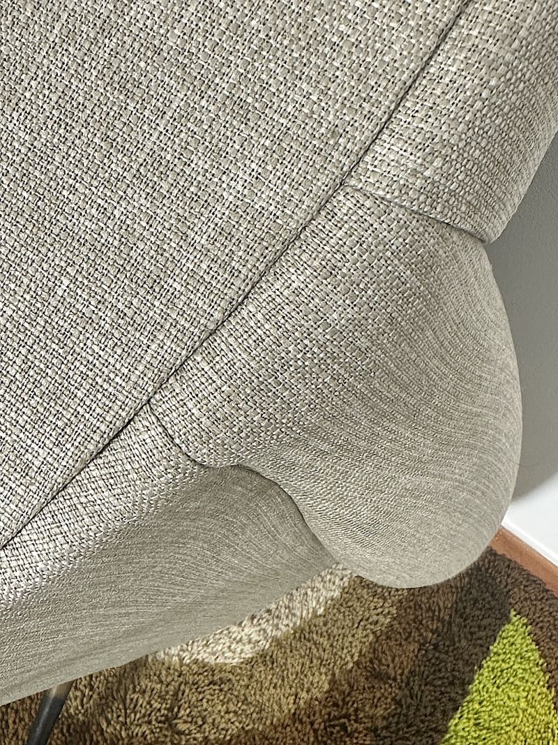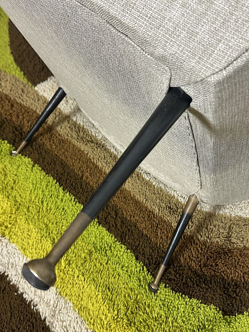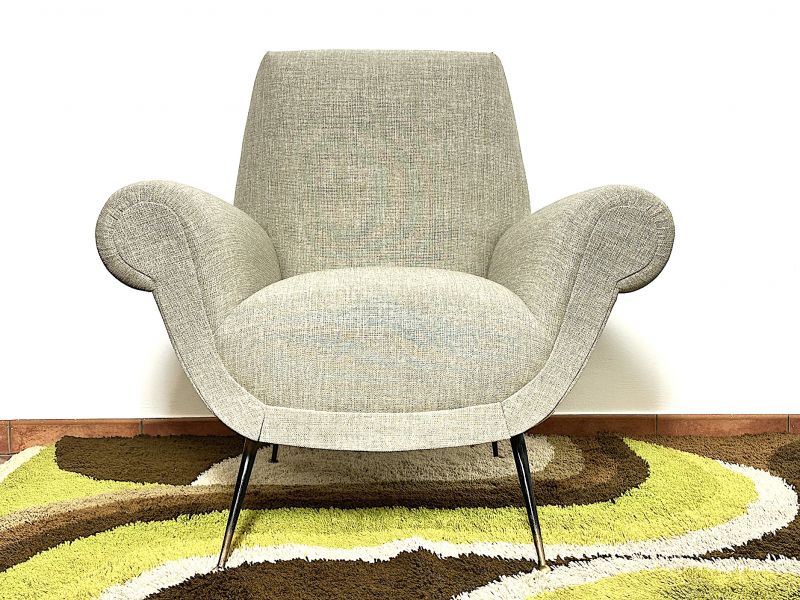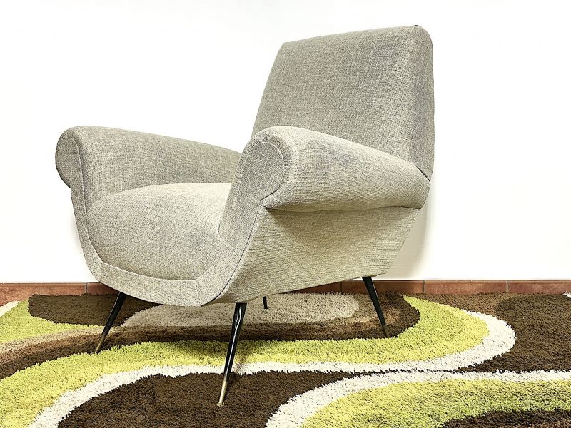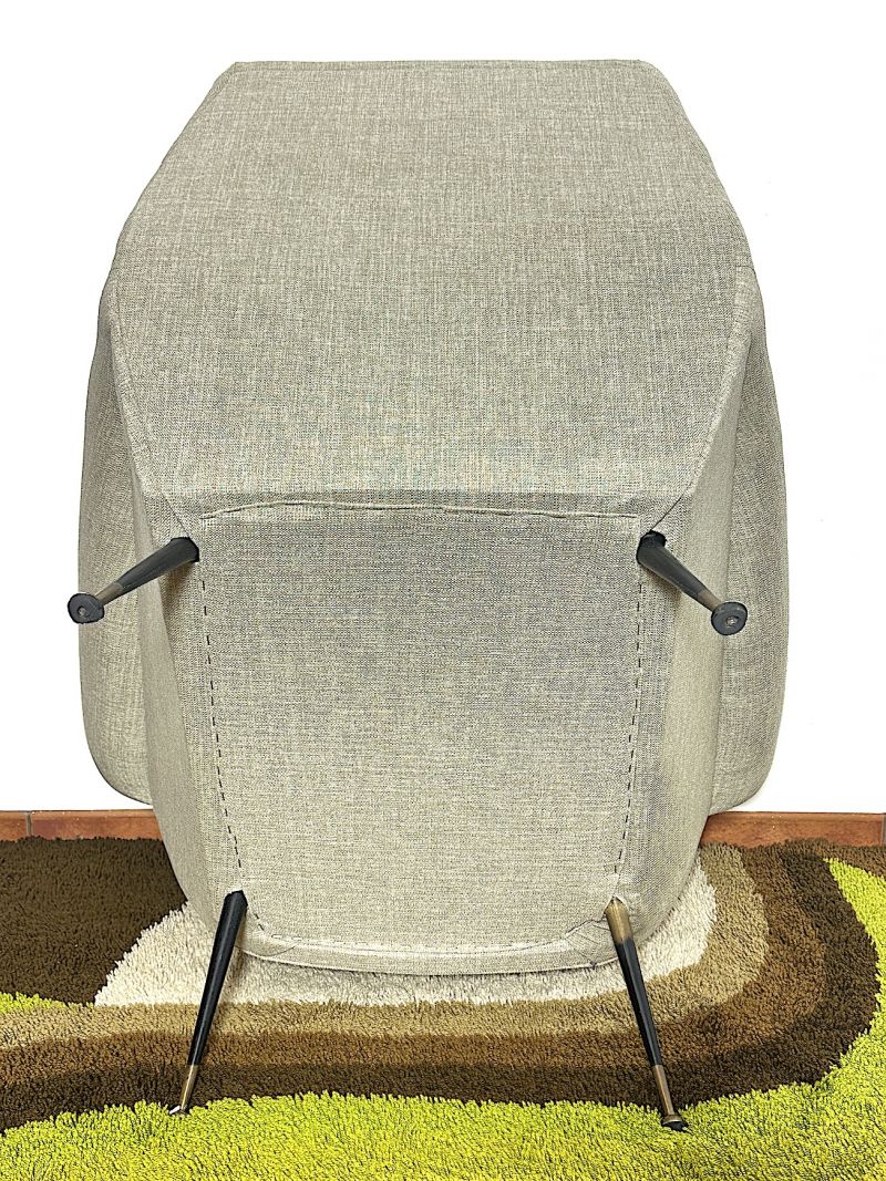 Extraordinary armchair from the 50s by designer GIGI RADICE, an icon of Mid-Century design. This piece perfectly embodies the elegant and sophisticated aesthetics of the era, with a harmonious design and refined details. Characterized by a slender structure, the armchair rests on tapered brass and metal legs, a distinctive element of Radice's creations, which give lightness and refinement, while the careful stitching and the delicately rounded profile draw attention to a high-level manufacturing. Completely restored, new interior and upholstery, the upholstery is in Sand (Beige) colored cotton. PERFECT CONDITIONS Measurements: Height 90 cm - Width 90 cm - Depth 80 cm - Seat 50 x 45 cm - Seat height 45 cm
