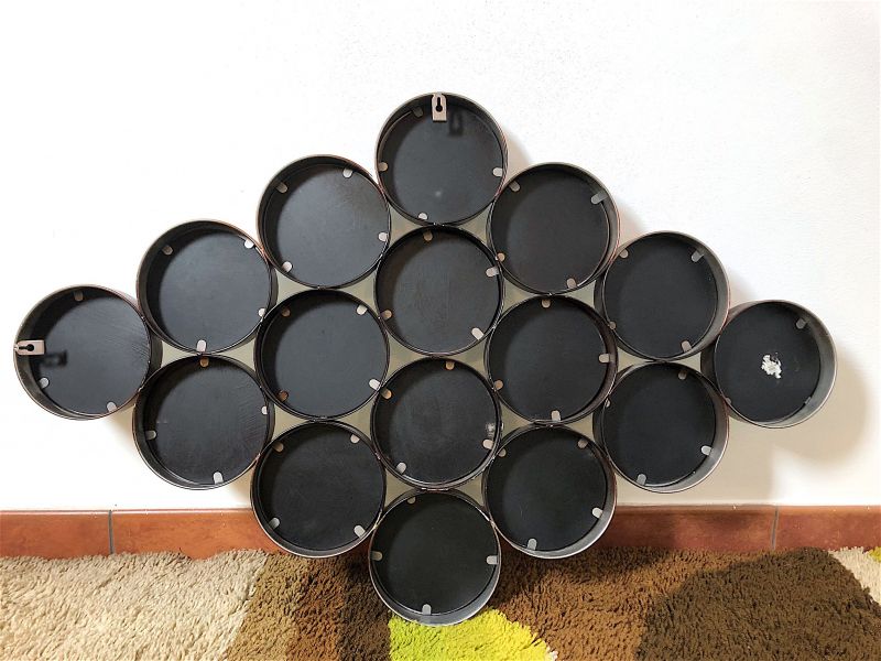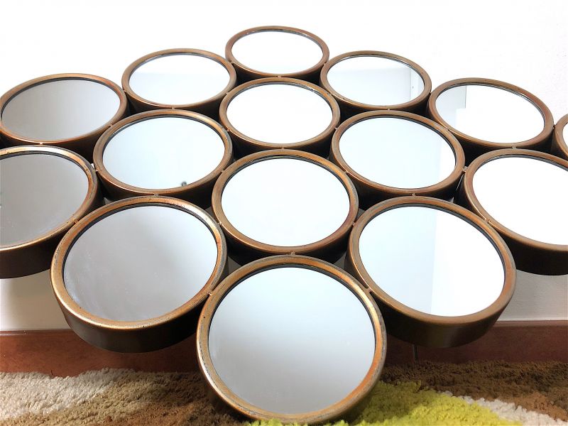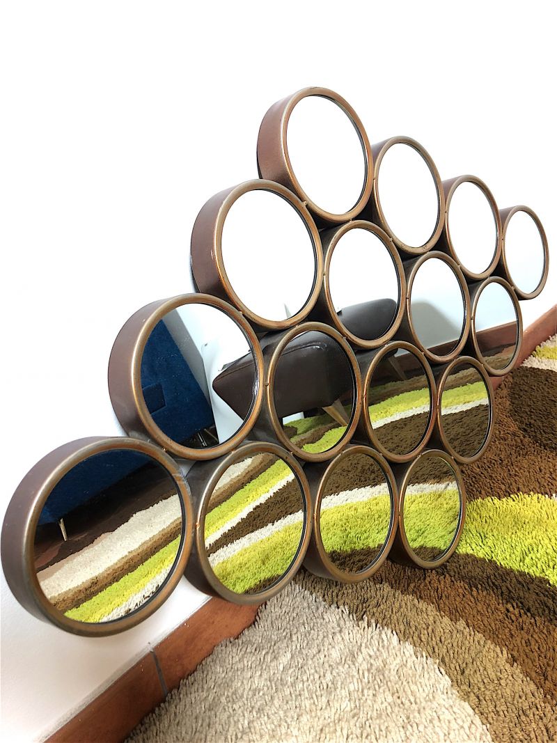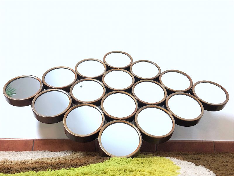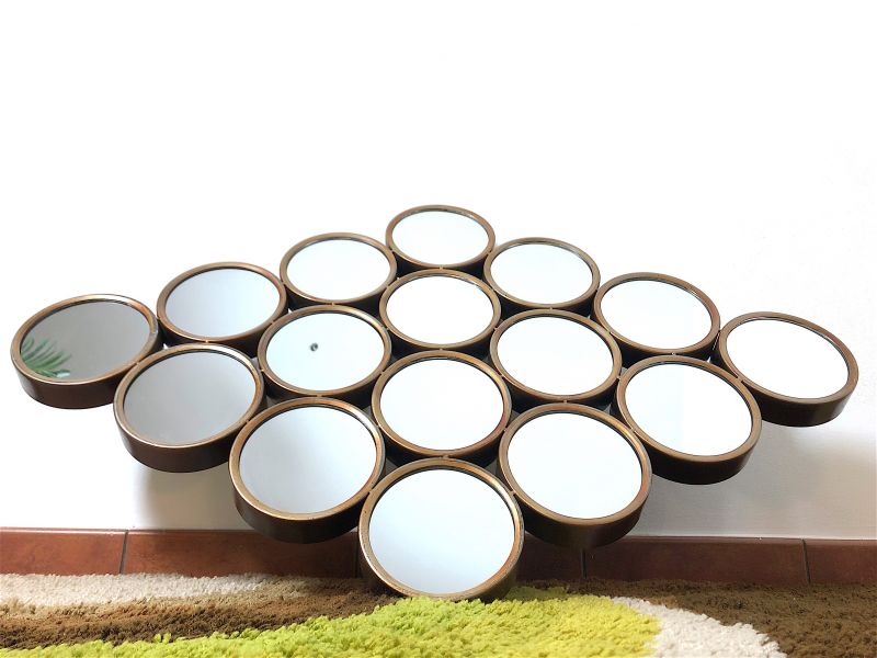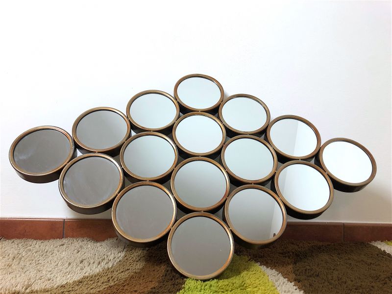 Vintage 80s wall mirror of Italian manufacture. Rhomboidal mirror in antiqued metal, composed of 16 round mirrors. The mirror is equipped with a double hook to be hung both horizontally and vertically. PERFECT CONDITIONS Measures: Height 63 cm - Width 97 cm - Depth 4 cm