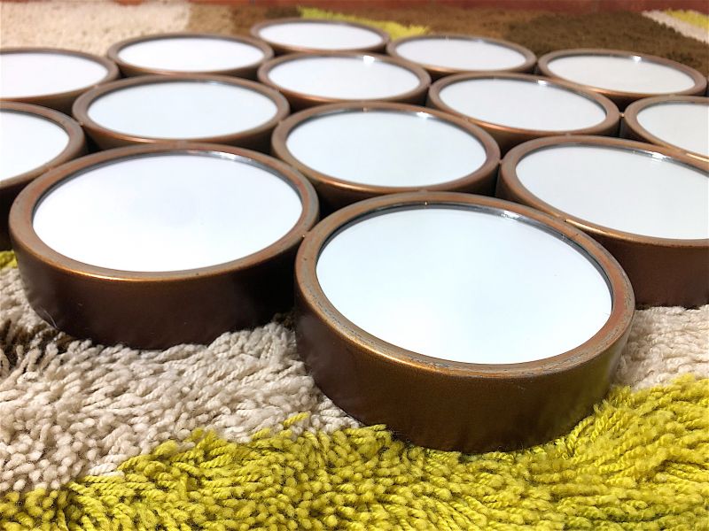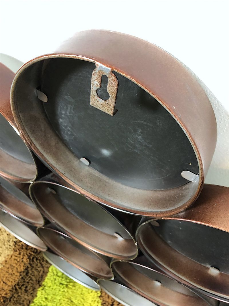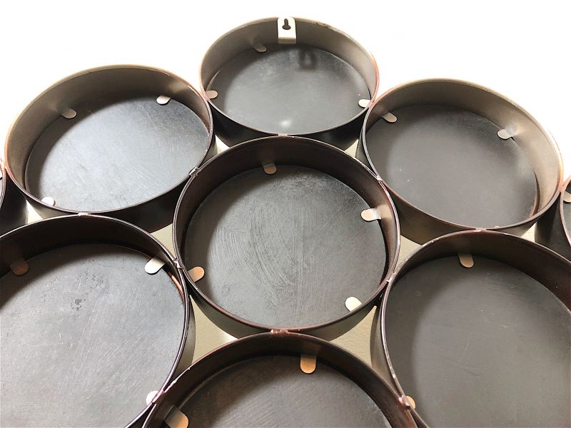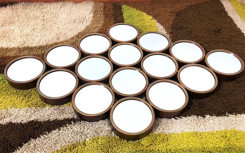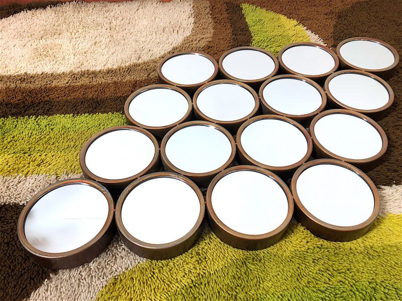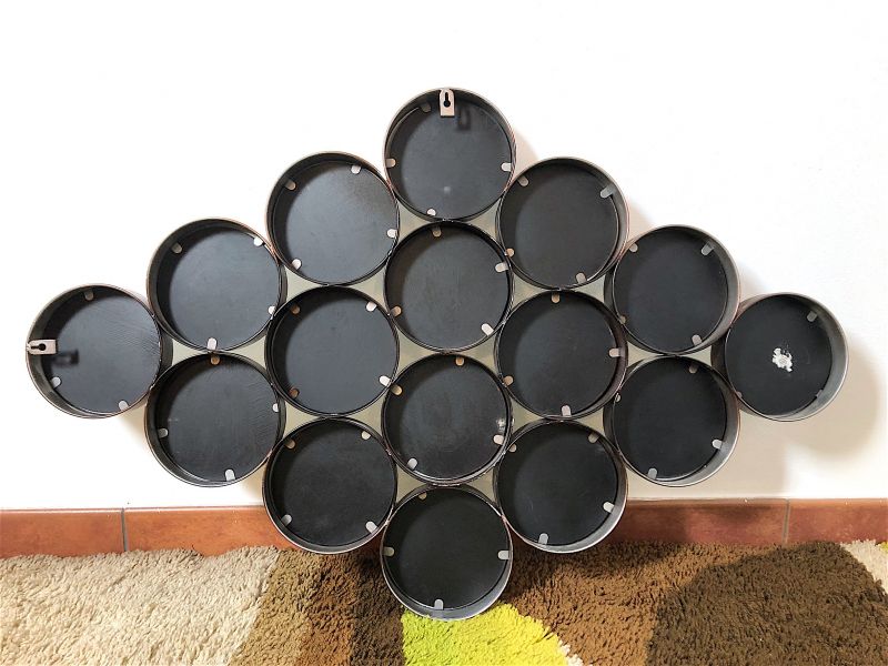 Vintage 80s wall mirror of Italian manufacture. Rhomboidal mirror in antiqued metal, composed of 16 round mirrors. The mirror is equipped with a double hook to be hung both horizontally and vertically. PERFECT CONDITIONS Measures: Height 63 cm - Width 97 cm - Depth 4 cm